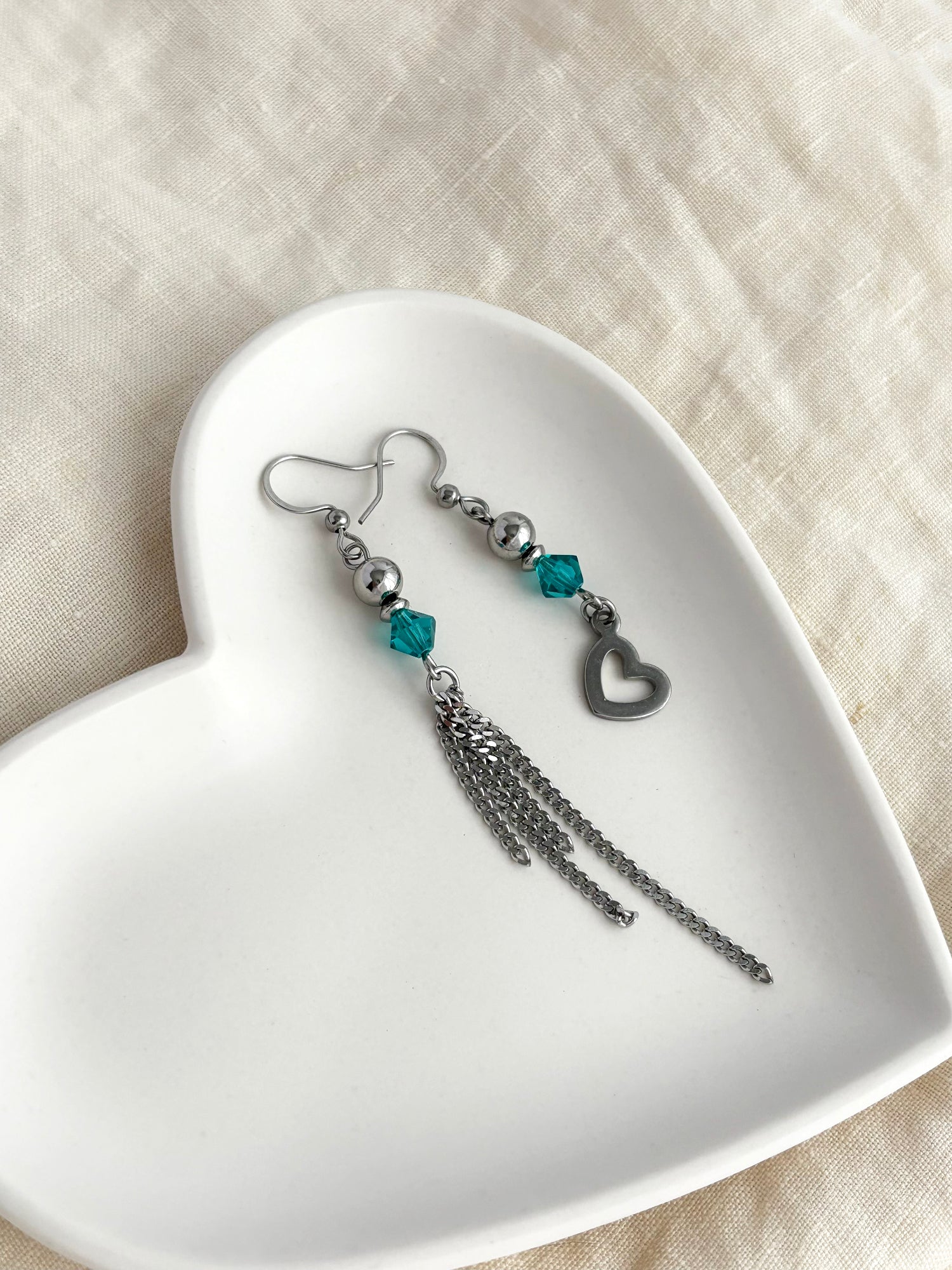 Voici les boucles d'oreilles uniques SHERRY! Celles-ci allient originalité et élégance avec leur design asymétrique unique. Composées de cristaux Swarovski turquoise, d’une breloque cœur et de chaînettes fines, le tout en en acier inoxydable argent, elles captent la lumière et ajoutent une touche à la fois romantique et moderne à ton look.