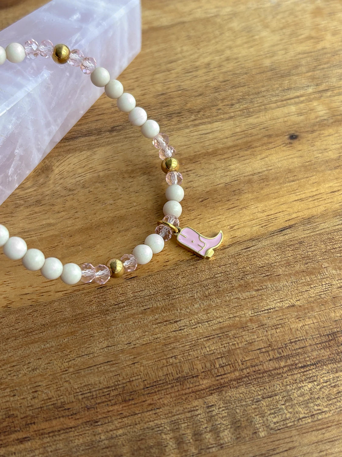 Composé de pierres fines Fossile couleur crème au fini mat et de petits cristaux roses scintillants, il est sublimé d’une adorable breloque botte de cowboy en acier inoxydable doré avec émail rose.