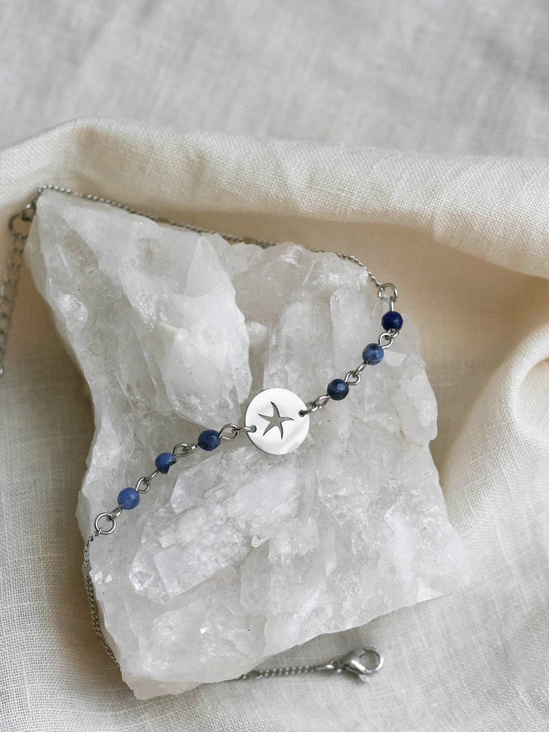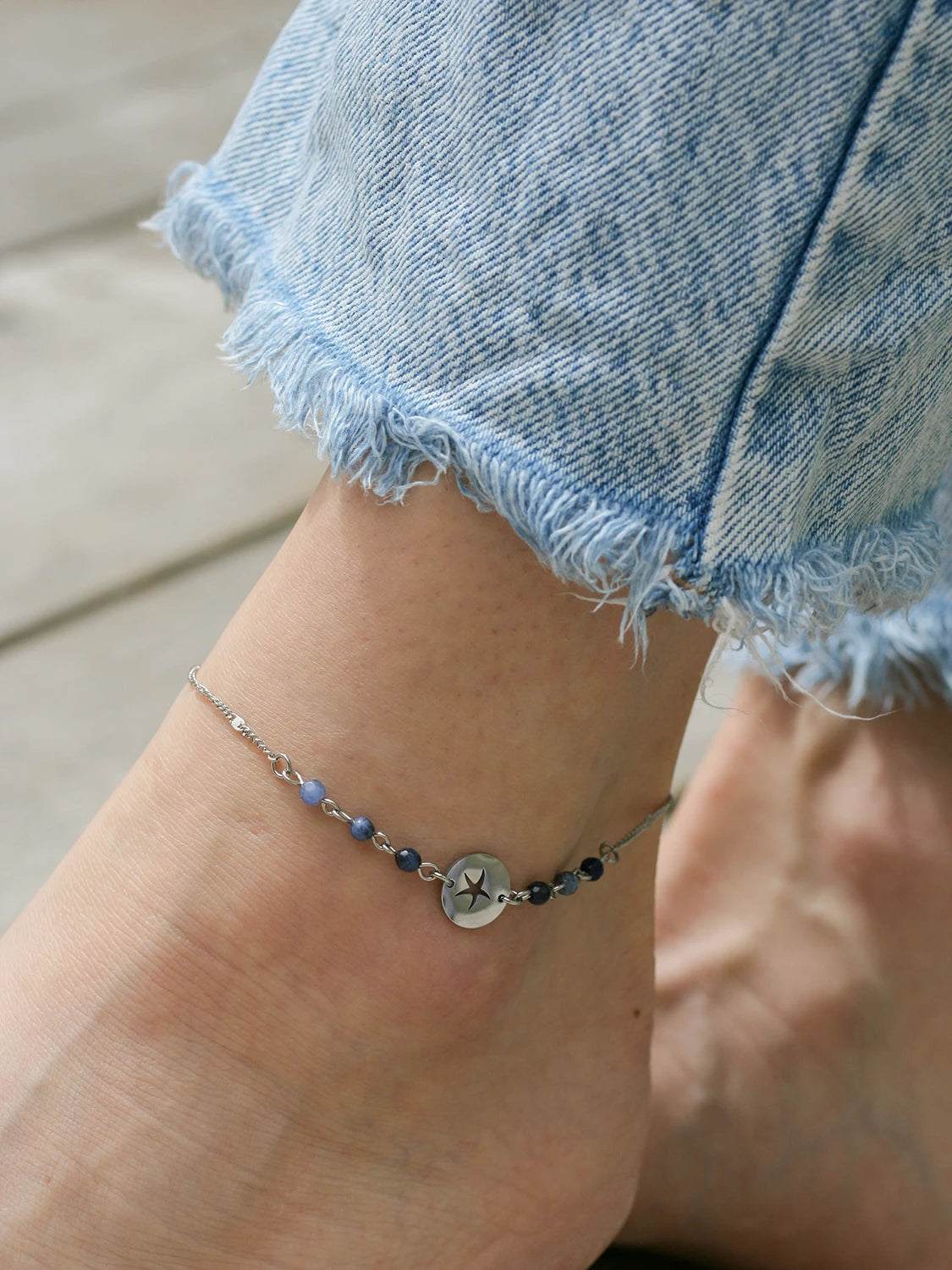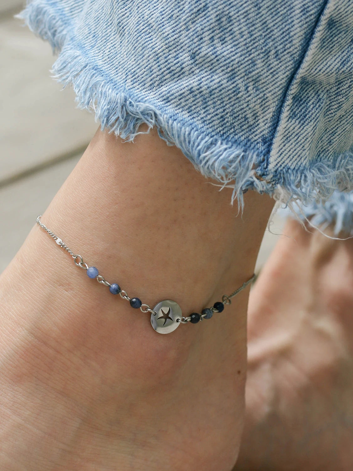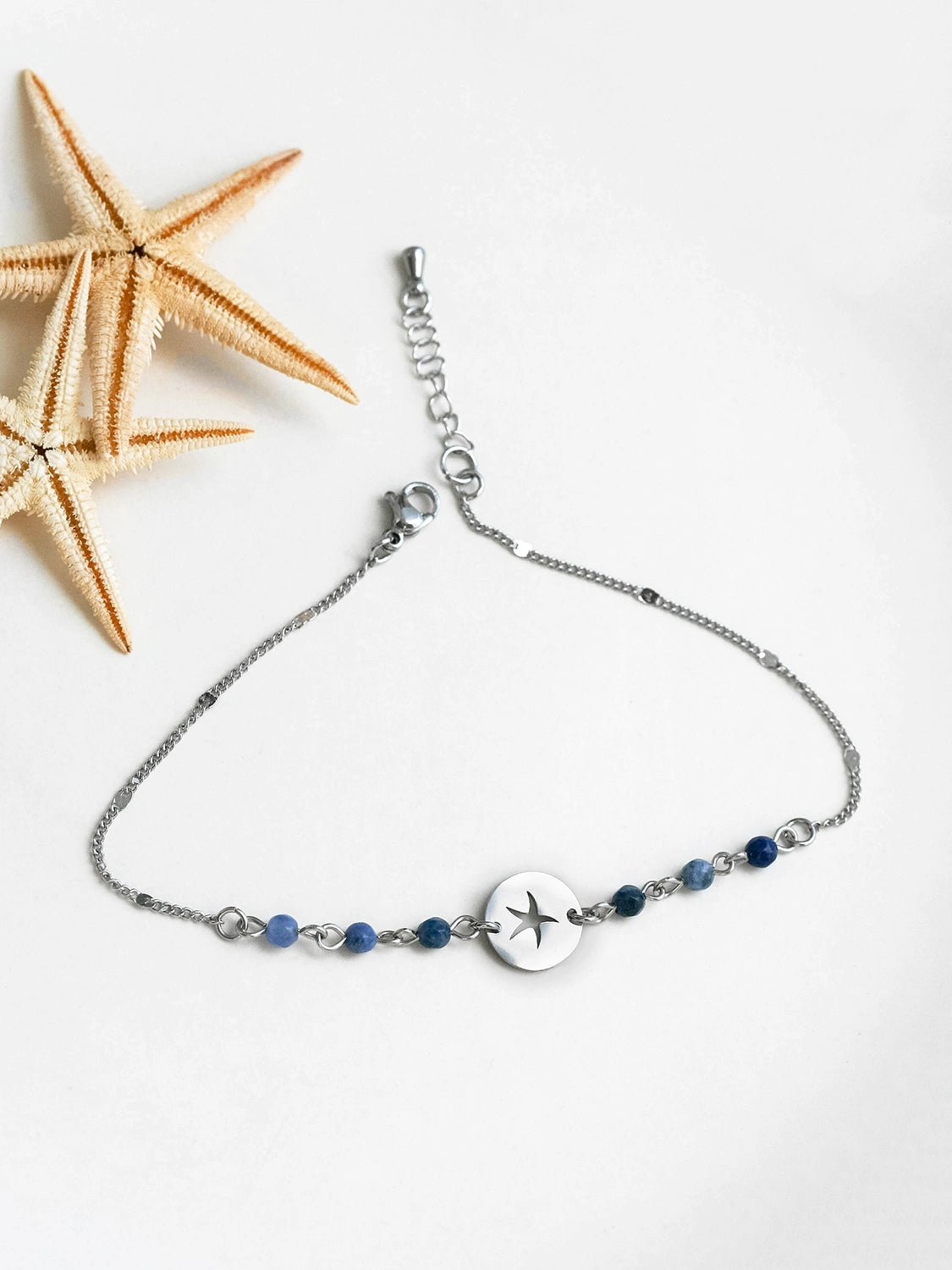 Féminine et gracieuse, cette chaîne de cheville en acier inoxydable argent est munie de pierres fines de Sodalite bleu minuit et d’un connecteur avec étoile de mer.