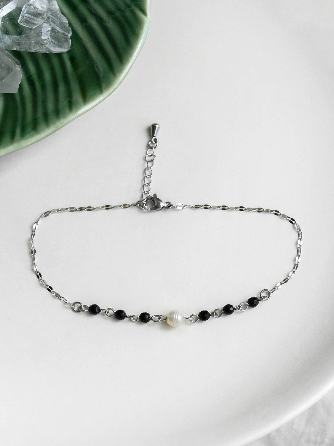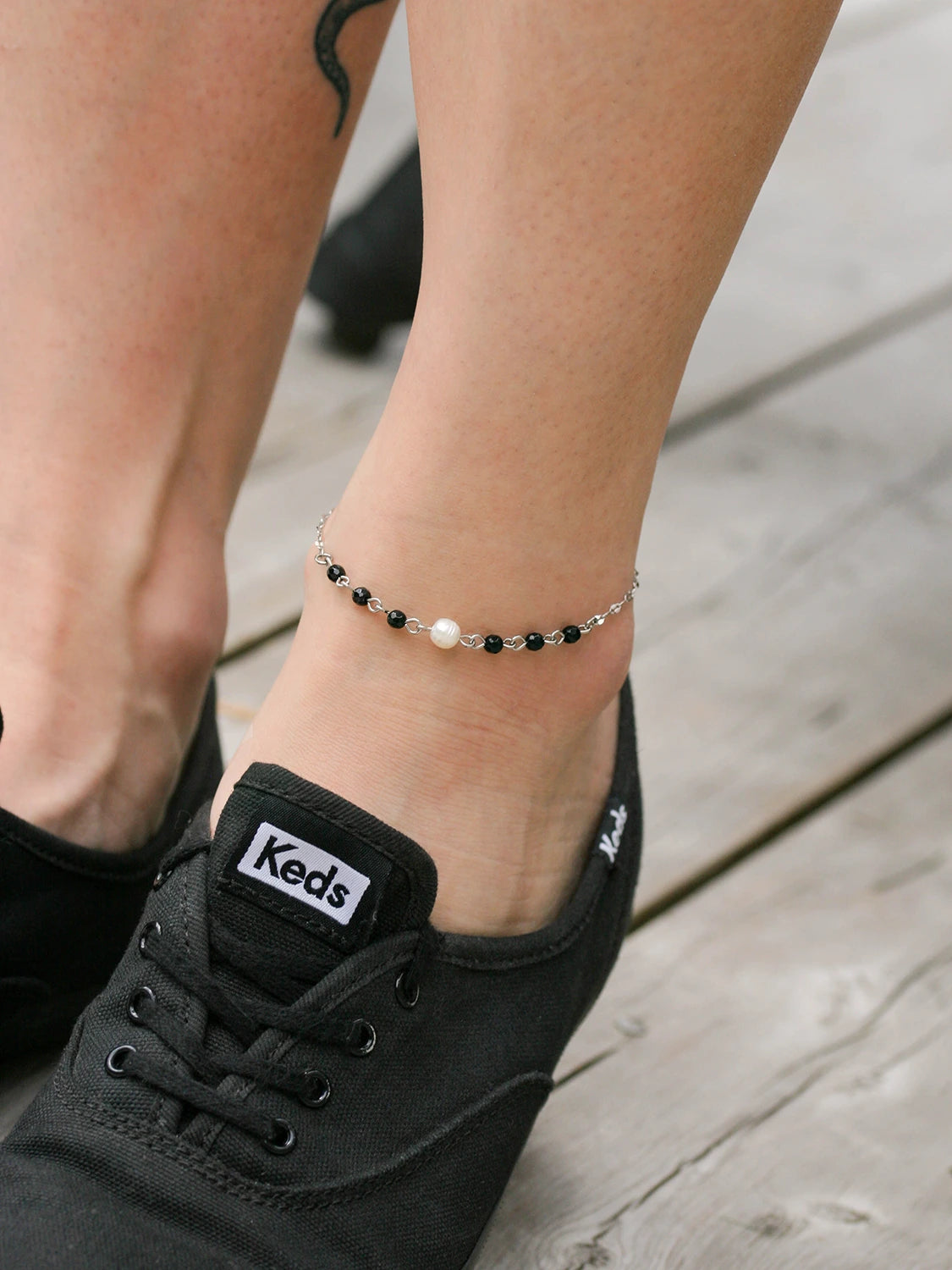Idéal pour rehausser tes tenues estivales, ce bijou de cheville est composé d’une délicate chaîne en acier inoxydable argent, de pierres fines d’Onyx noir et d’une jolie perle d’eau douce véritable.