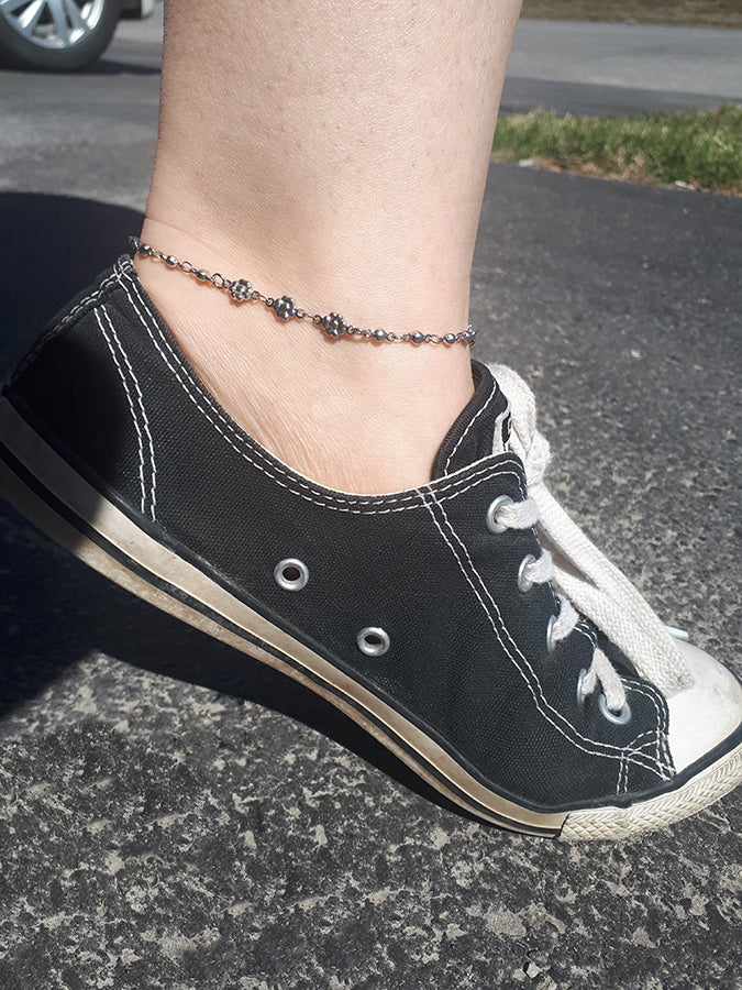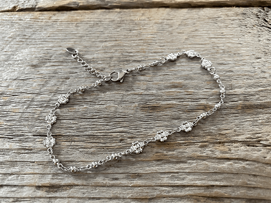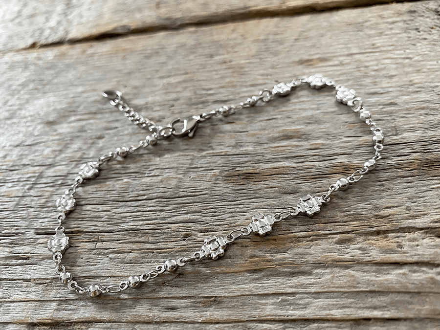 Cette chaîne de cheville est faite d'une chaîne en acier inoxydable argenté comportant un mélange de mailles en forme de billes et de fleurs. Vous adorerez ses belles textures sur votre cheville, le look est absolument ravissant!
