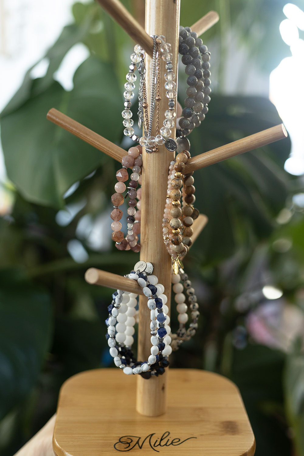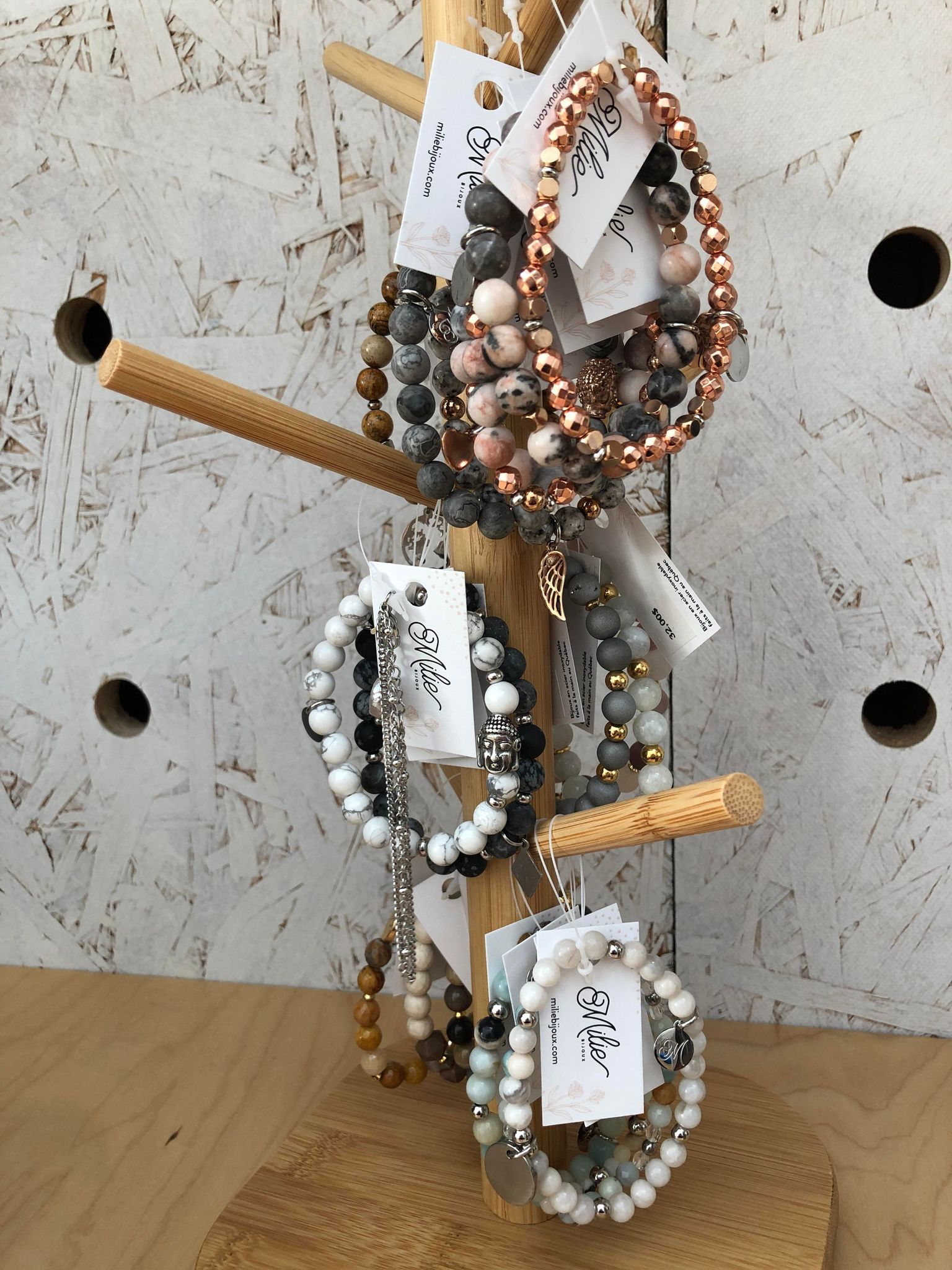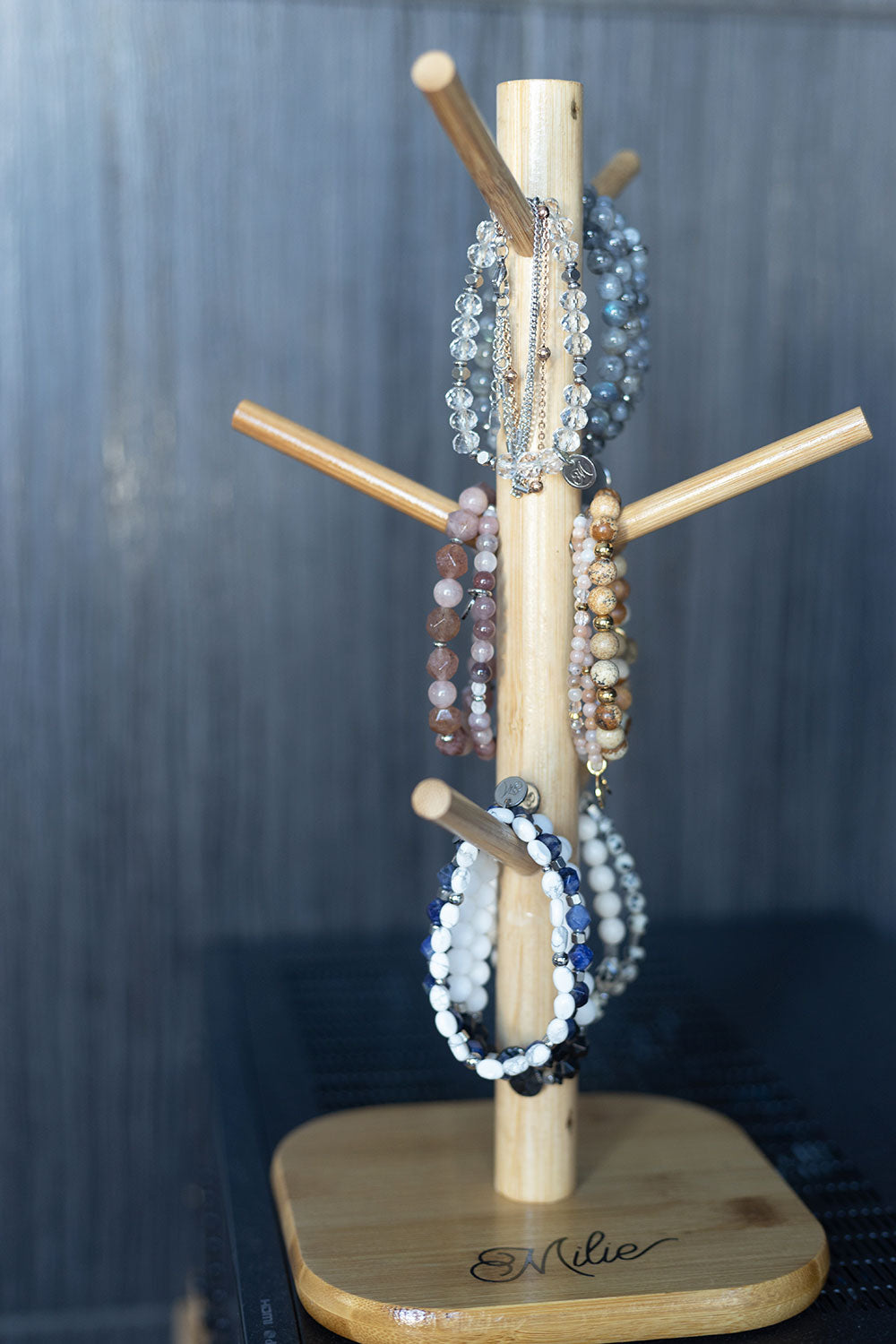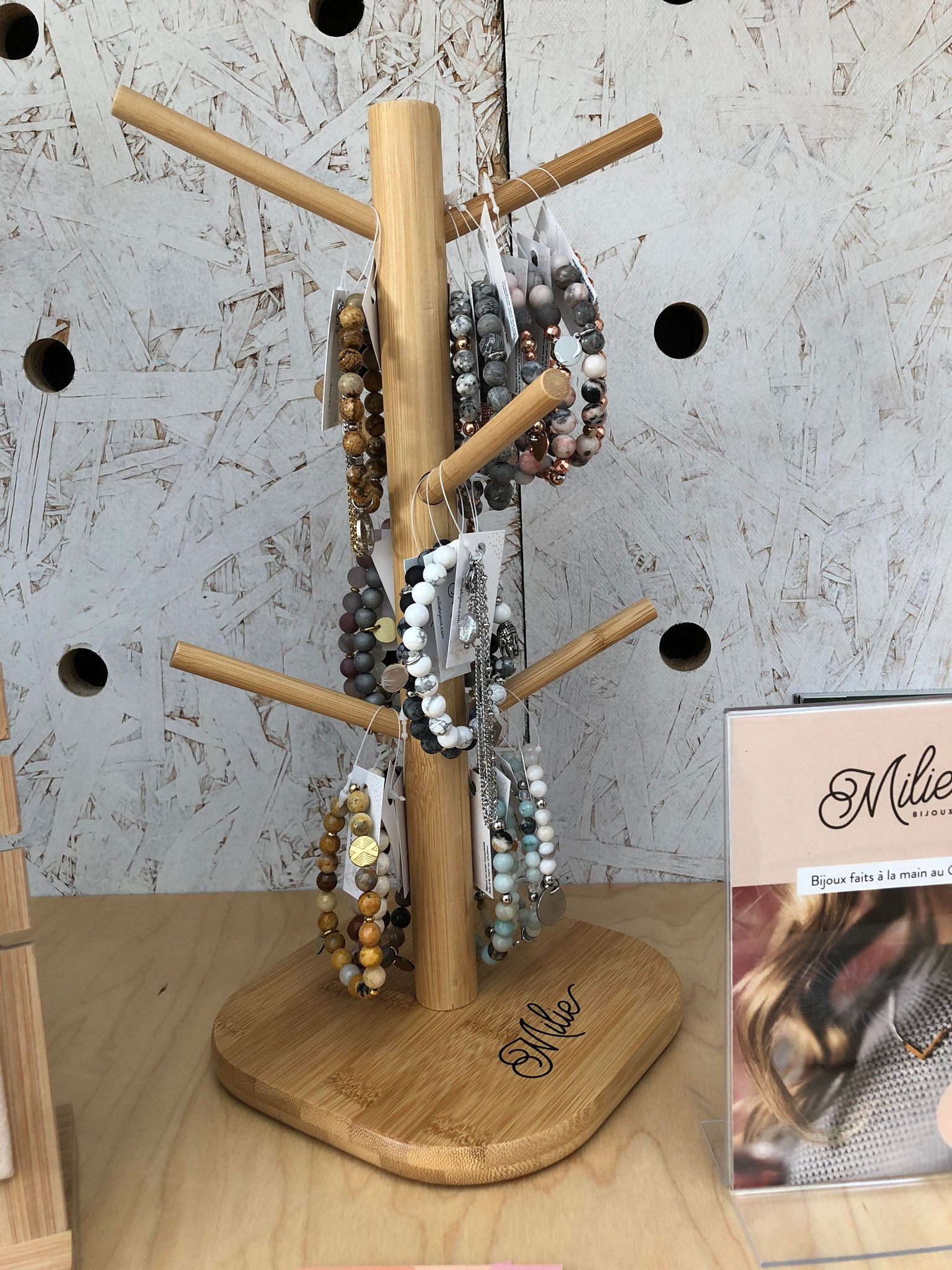Le présentoir Milie Bijoux, entièrement fait de bois de bambou, est idéal pour classer vos bracelets et colliers courts. Léger, compact et stylé, il ajoutera une petite touche digne de Pinterest à votre rangement!